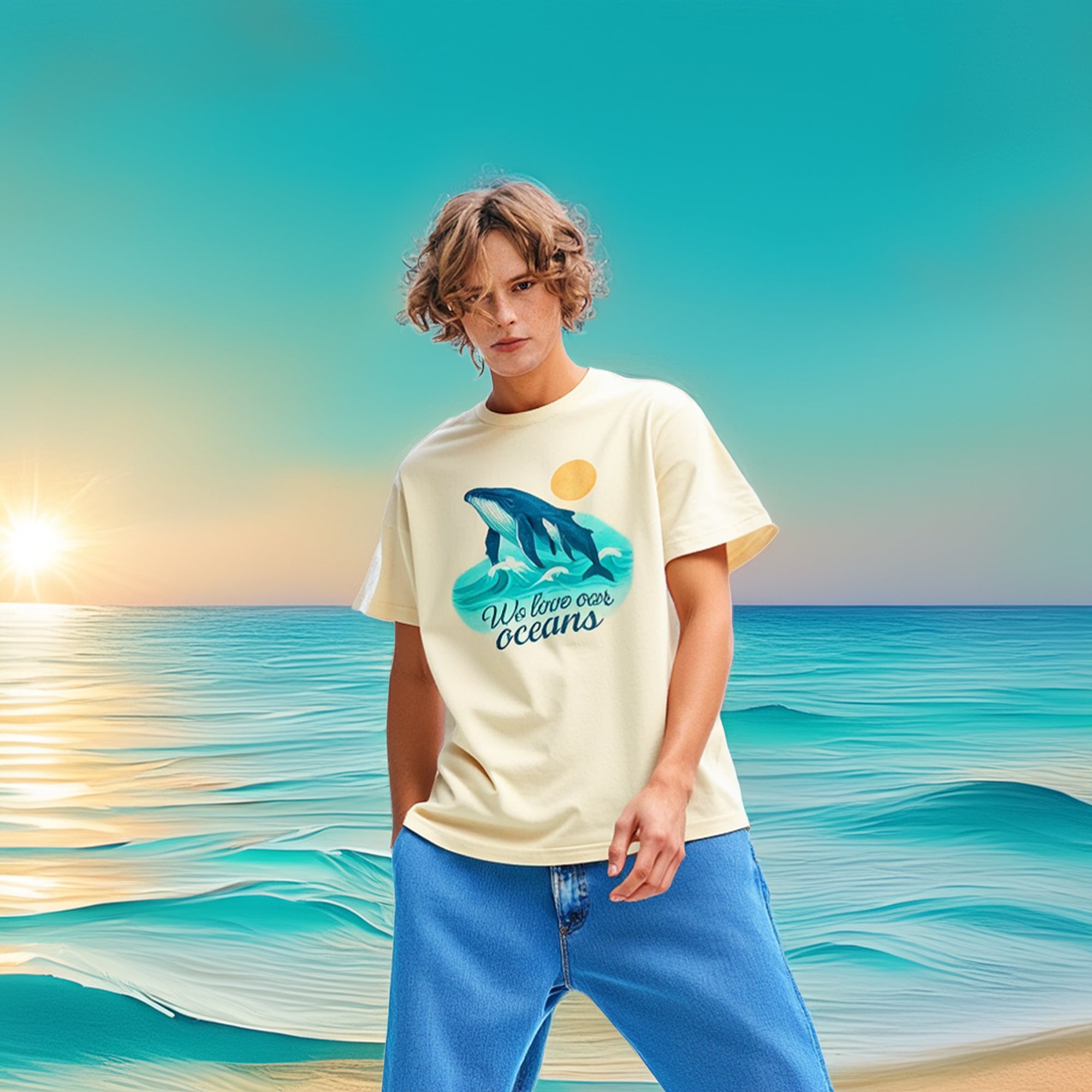 Inspiré des grands cétacés, des vagues turquoise et du soleil doré, ce t-shirt célÚbre la beauté de nos mers et rappelle que la mode peut (et doit) avoir du sens.
