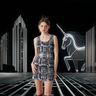 Entre lignes fractales et reflets métalliques, la robe Cityscape murmure le langage secret des villes endormies.